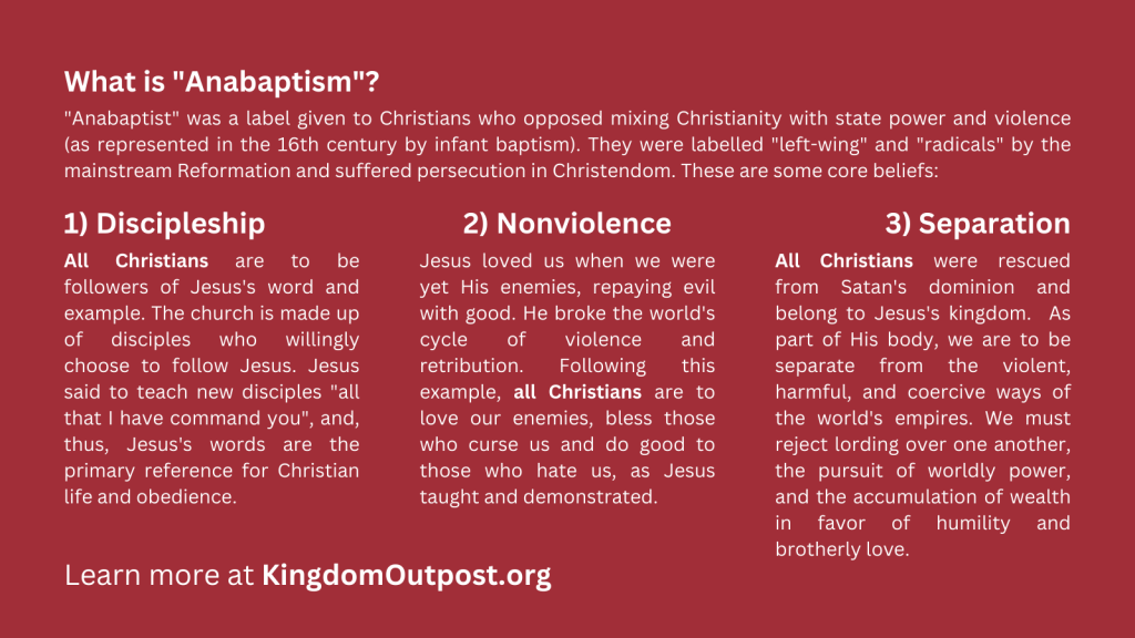 The “Kingdom of God” is admittedly a very general term that has been adopted by Crusaders, nationalists, and dominionists like the “Kingdom now!” folks. Of course, we draw from the Anabaptist definition of the Kingdom, one that is not “sectarian” or denominational but that is in fact shared and professed by many faithful Christians throughout the ages. Anabaptists never came from a vacuum or existed in a vacuum – Erasmus and Karlstadt during the Reformation era and Dietrich Bonhoeffer in more recent times were highly influential in shaping Anabaptist writings. The Church Fathers and early church history have much to contribute, showing us that ethics, the pursuit of justice for the suffering, and a witness of peace are central to practical Christian living. Petr Chelchicky and Gottfried Arnold from the Bohemian Reformation and the Pietist movement respectively expressed very similar views in their time as do modern theologians/authors like Jacques Ellul, Stanley Hauerwas, N. T. Wright, and Michael Gorman.