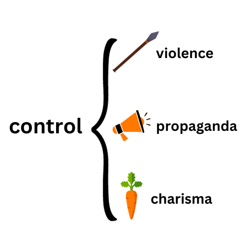 Probably the most important thing you need to understand about propaganda is that it is all about control. There are three basic ways you can control people. The most effective way to control someone is through violence. If you are bigger and stronger than them, then you can guarantee control through physical force. However, violence tends to be extremely risky in that you always run the risk that you’ve mis-assessed your strength or your opponent’s weakness. Violence is also abrasive rather than subtle. If not done in extreme enough measure, it can have the opposite effect of sparking push-back and rebellion. Therefore, violence is risky and often used as a last resort.
